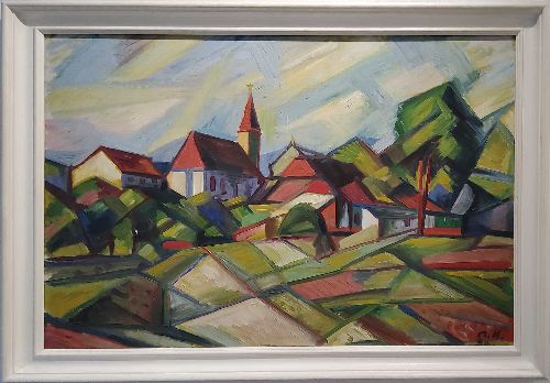 38. Karl Adolf Krepcik, Dorf mit Kirche, Öl auf Karton, kaschiert