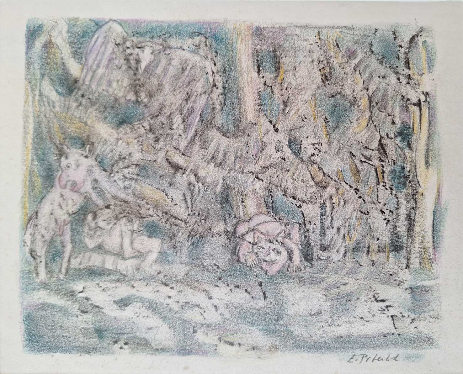 "Albtraum II", Graphit, Pastell, Farbstift, 2026, 42.3 x 52.3 cm, Bild: 20 x 25.5 cm , € 850.--