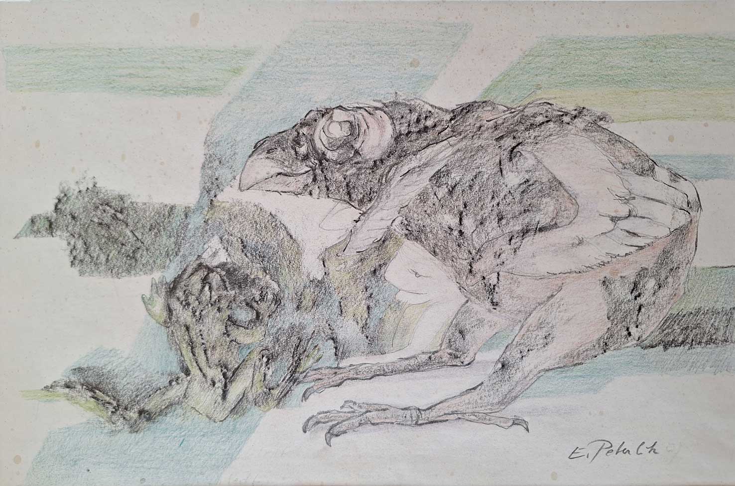 "Kernbeisser", Graphit, Pastell, Farbstift, 2026, 42.3 x 52.3 cm, Bild: 21.5 x 33 cm , € 850.--