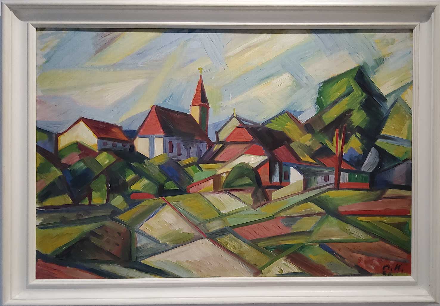 "Dorf mit Kirche", Öl auf Karton, kaschiert, 1956, , € 1500.--