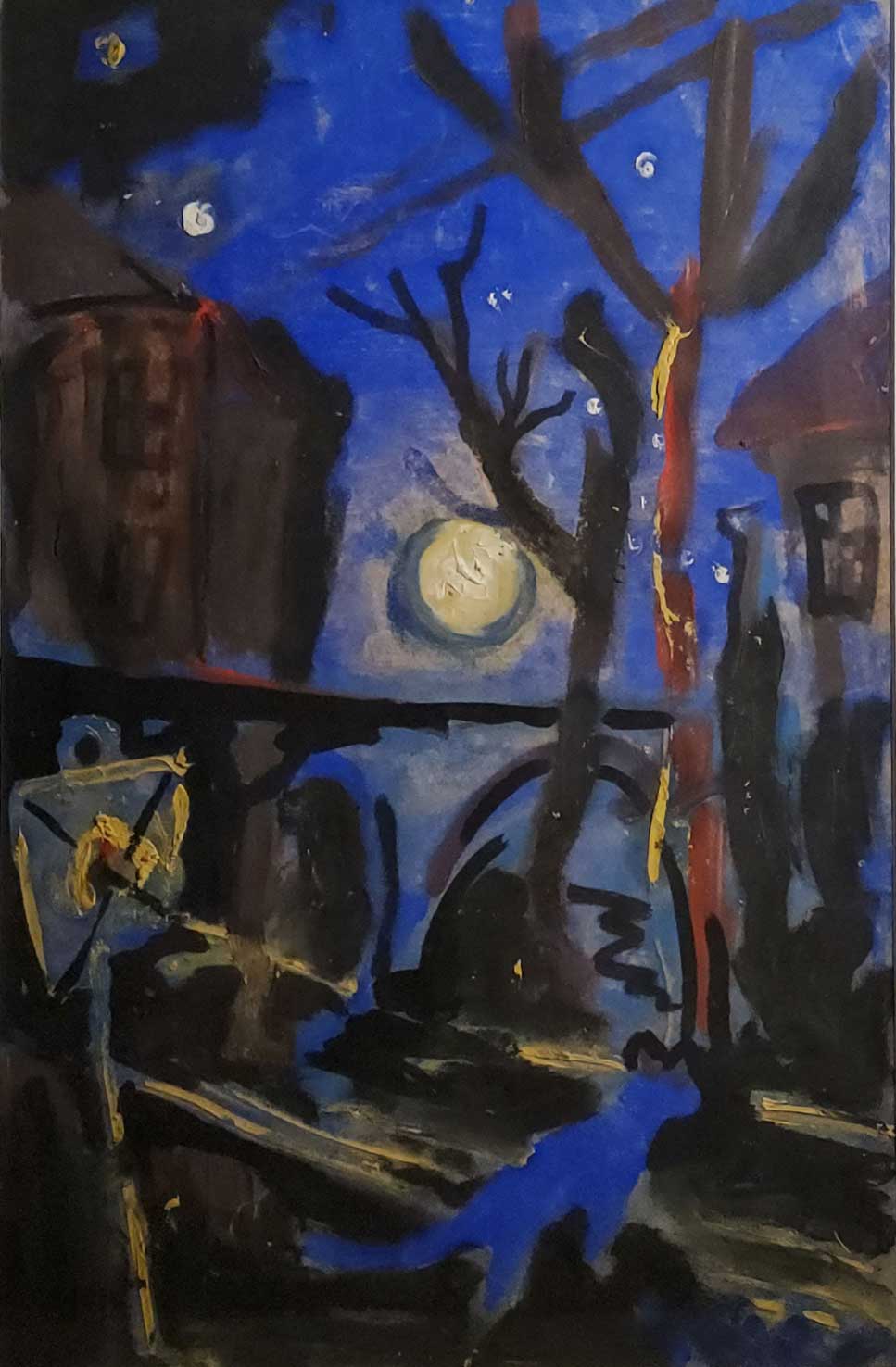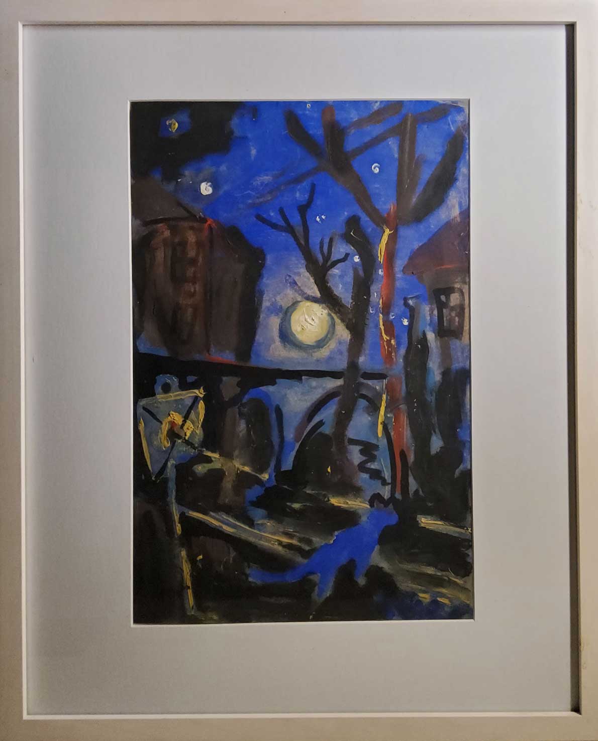 "Blaue Katze im Vollmond", Acryl auf Karton, nicht datiert, 53 x 43 cm, Bild: 38 x 24.5 cm , € 250.--