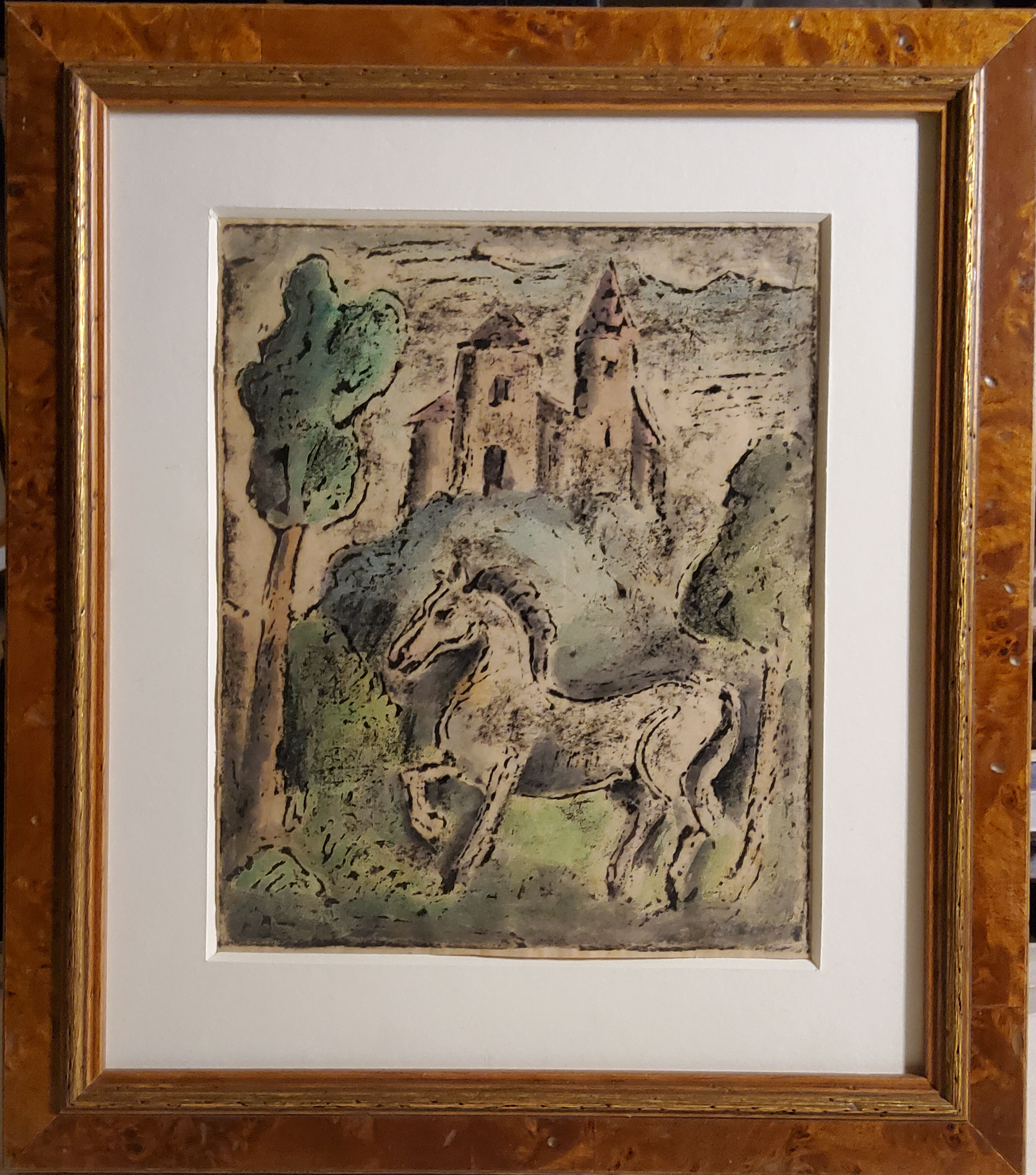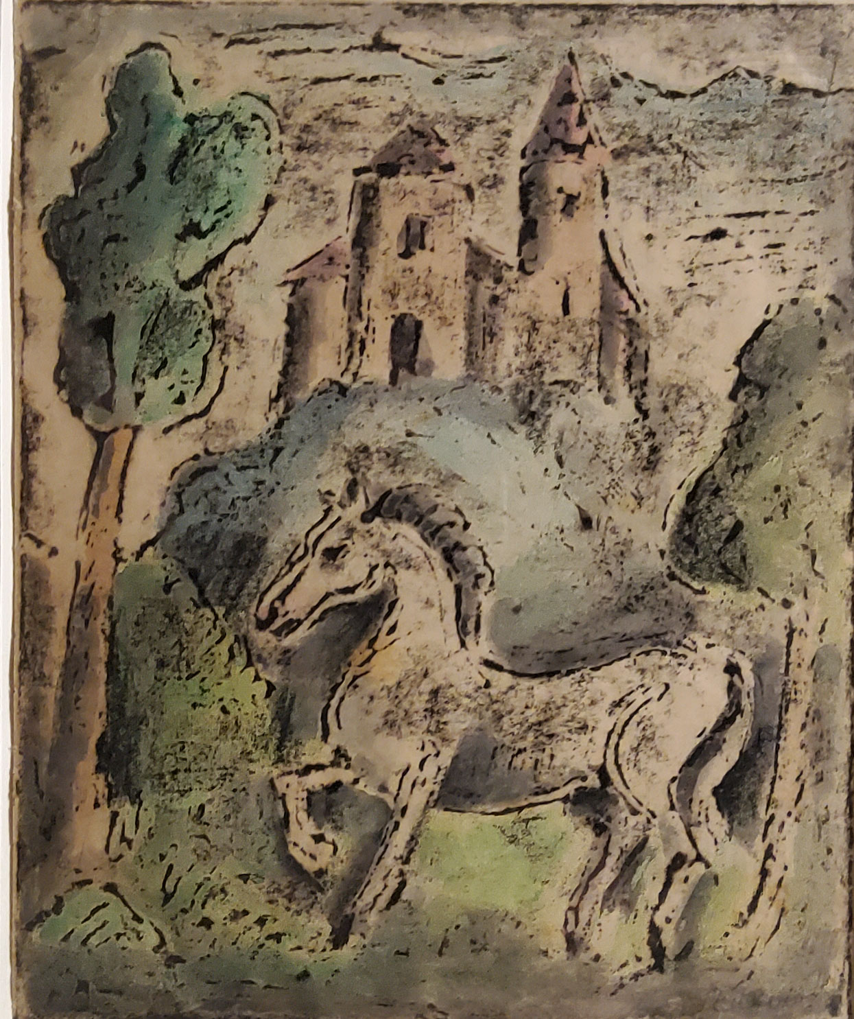 "Pferd vor Schloss", Lithographie, koloriert, nicht datiert, 31 x 35 cm, Bild: 22.8 x 18.6 cm , € 300.--
