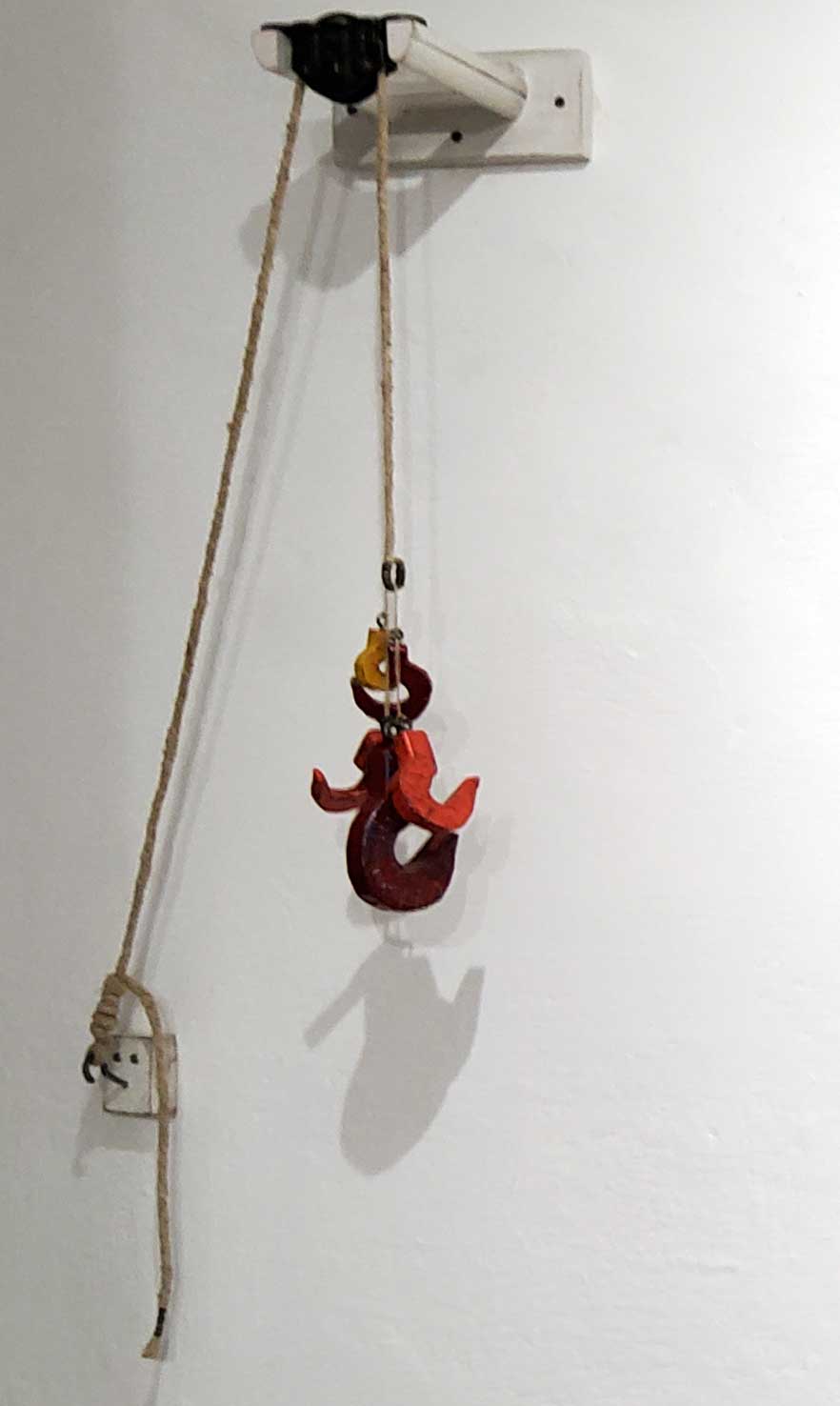 "Untitled", Buchbinder Karton, Acryl, Holz, Seil, Draht, window weight roller, 2025, 100 x 44 x 16.5 cm , € 850.--